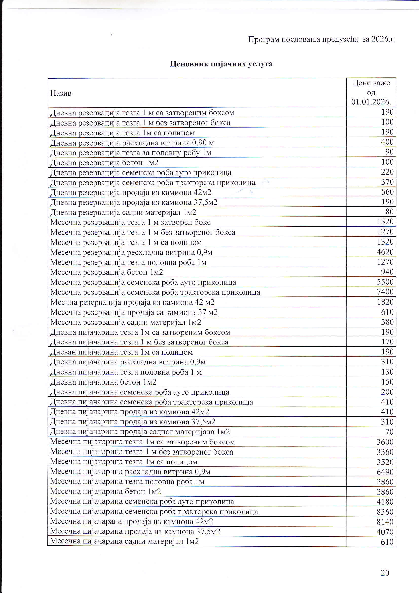 ЦЕНОВНИК ПИЈАЧНИХ УСЛУГА И ПОСЛОВНОГ ПРОСТОРА (цене су у динарима)